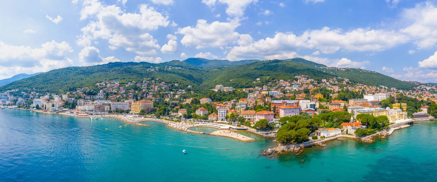 Opatija ist eine Stadt in Kroatien, die an der Kvarner Bucht in der Region Primorje-Gorski Kotar liegt. Sie ist bekannt für ihre elegante Architektur, die von der Zeit des Habsburgerreiches geprägt ist, und gilt als einer der ältesten und bekanntesten Kurorte an der Adriaküste. Opatija ist berühmt für ihre wunderschöne Uferpromenade, die Lungomare, die sich über mehrere Kilometer entlang der Küste erstreckt und atemberaubende Ausblicke auf das Meer bietet. Die Stadt hat eine reiche Geschichte, die im 19. Jahrhundert begann, als sie zu einem beliebten Ziel für wohlhabende Touristen und Aristokraten wurde, die die heilenden Eigenschaften des mediterranen Klimas und der Umgebung suchten.